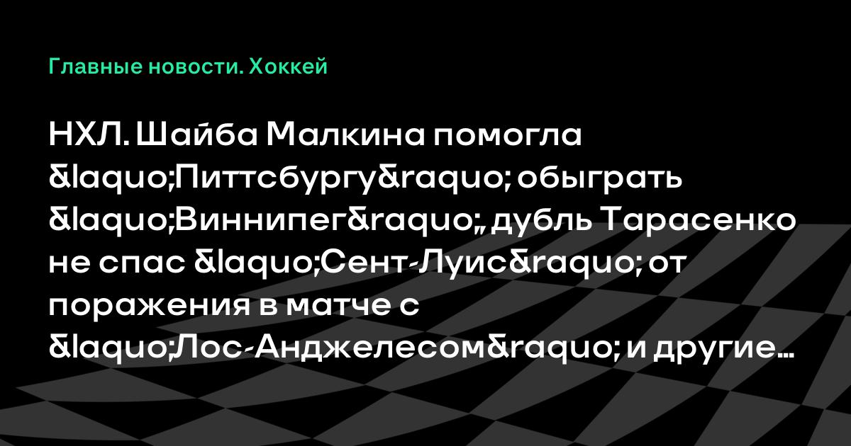 НХЛ. Шайба Малкина помогла «Питтсбургу» обыграть «Виннипег», дубль Тарасенко не спас «Сент-Луис» от поражения в матче с «Лос-Анджелесом» и другие результаты