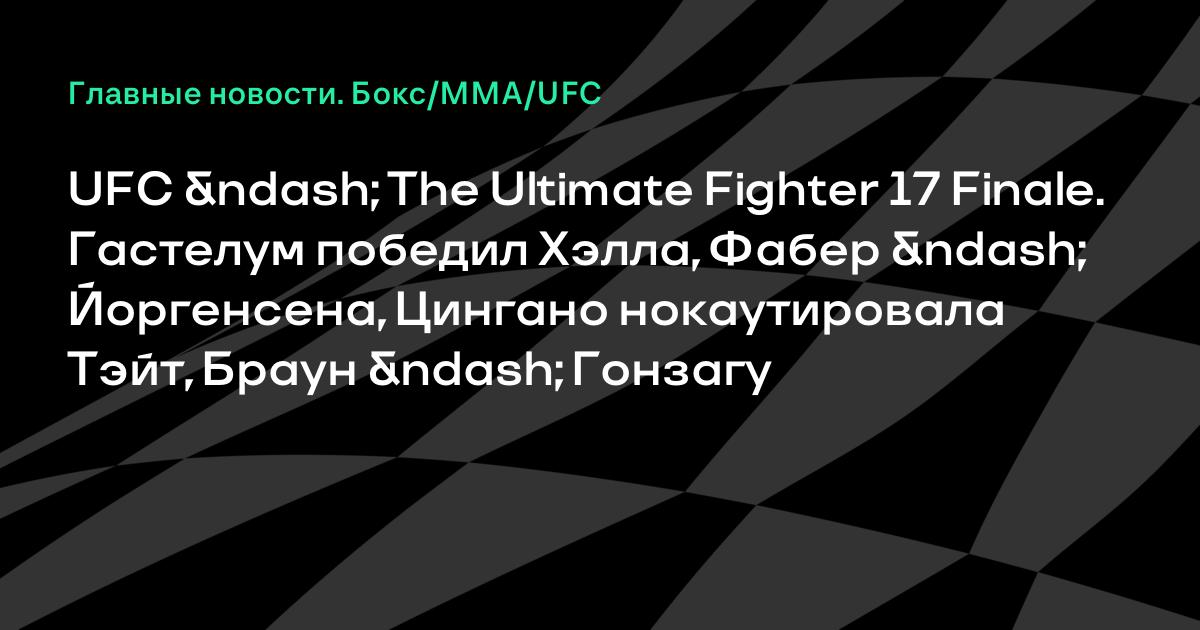 UFC – The Ultimate Fighter 17 Finale. Гастелум победил Хэлла, Фабер – Йоргенсена, Цингано нокаутировала Тэйт, Браун – Гонзагу