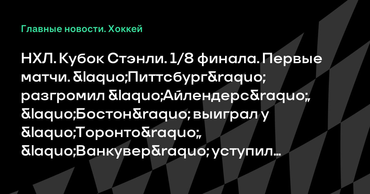 2 мая 2013, 09:16 НХЛ. Кубок Стэнли. 1/8 финала. Первые матчи. «Питтсбург» разгромил «Айлендерс», «Бостон» выиграл у «Торонто», «Ванкувер» уступил «Сан-Хосе» Хоккей результаты матчей Питтсбург Айлендерс Торонто Бостон Кубок Стэнли Ванкувер Сан-Хосе НХЛ