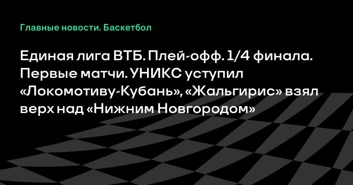 В среду, 15 мая, стартуют две серии 1/4 финала плей-офф Единой лиги ВТБ. Казанский УНИКС на своей площадке уступил краснодарскому «Локомотиву-Кубань». «Нижний Новгород» на выезде проиграл литовскому «Жальгирису».