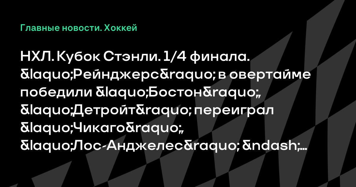 Сегодня состоялись три четвертьфинальных встречи Кубка Стэнли. «Бостон» не смог завершить серию с «Рейнджерс», уступив в овертайме со счетом 3:4. «Чикаго» в гостях проиграл «Дейтройту» (0:2), а «Лос-Анджелес» одолел «Сан-Хосе» (3:0).