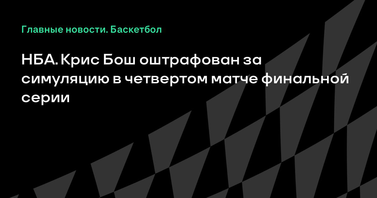 Форвард «Майами» Крис Бош оштрафован на 5 000 долларов за симуляцию в четвертом матче финальной серии плей-офф с «Сан-Антонио» (109:93, 2-2), сообщает The Associated Press.
