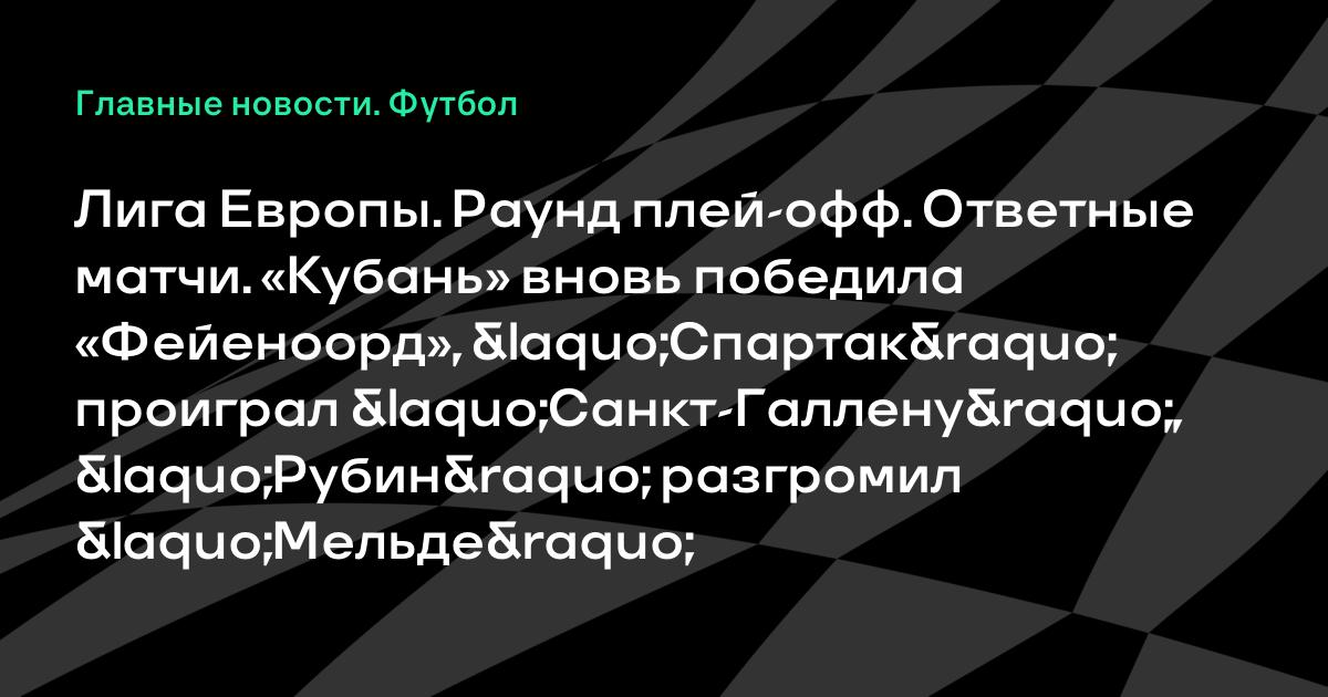 Лига Европы. Раунд плей-офф. Ответные матчи. «Кубань» вновь победила «Фейеноорд», «Спартак» проиграл «Санкт-Галлену», «Рубин» разгромил «Мельде»