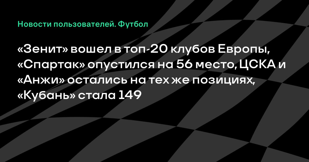 «Зенит» вошел в топ-20 клубов Европы, «Спартак» опустился на 56 место, ЦСКА и «Анжи» остались на тех же позициях, «Кубань» стала 149