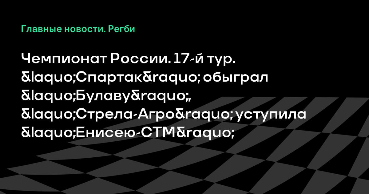 Сегодня прошли матчи 17-го тура чемпионата России по регби. «Спартак» обыграл «Булаву» (31:19), «Стрела-Агро» уступила «Енисею-СТМ» (7:38).