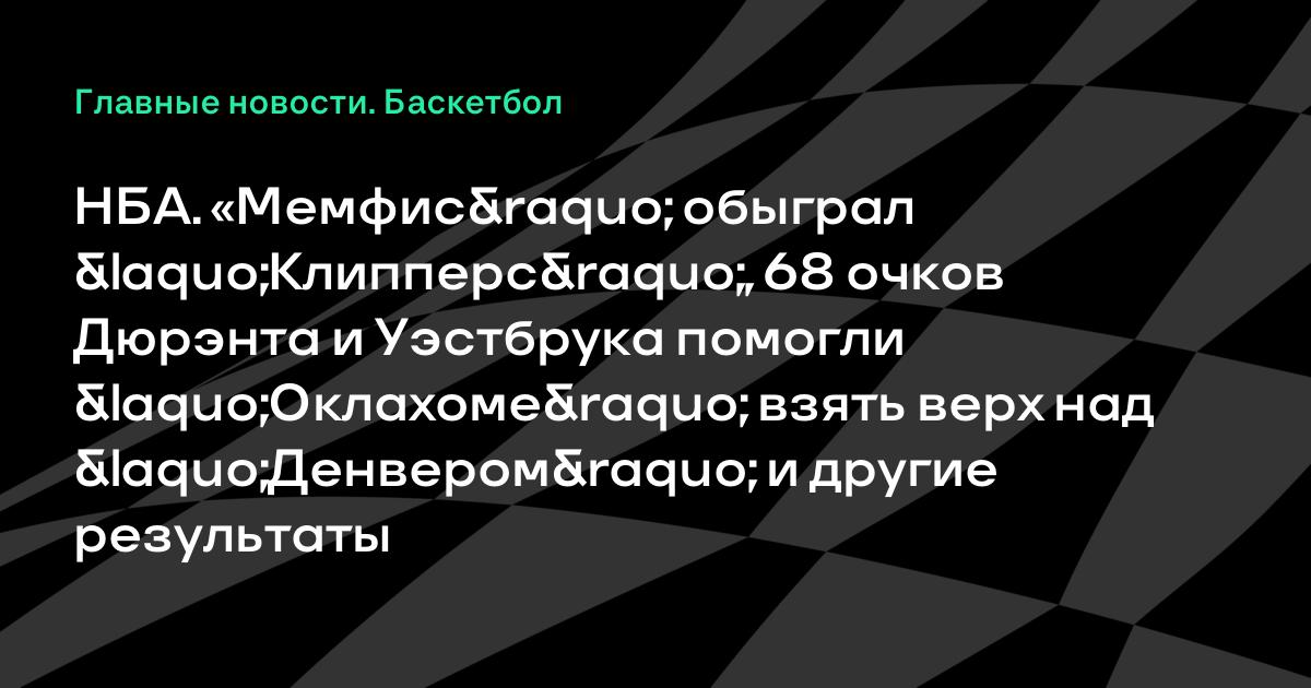 НБА. «Мемфис» обыграл «Клипперс», 68 очков Дюрэнта и Уэстбрука помогли «Оклахоме» взять верх над «Денвером» и другие результаты