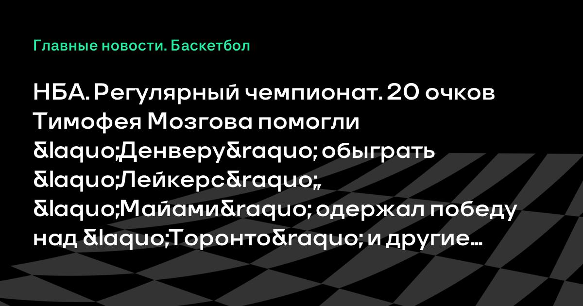 НБА. Регулярный чемпионат. 20 очков Тимофея Мозгова помогли «Денверу» обыграть «Лейкерс», «Майами» одержал победу над «Торонто» и другие результаты