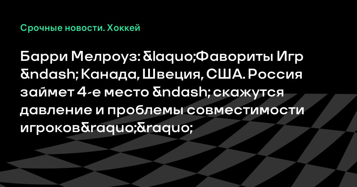 Россия? Думаю, что она займет 4-е место. Мне нравится их состав, у них много отличных игроков, но давление на них и проблемы с совместимостью хоккеистов из двух лиг сыграют свою роль», – сказал Мелроуз.