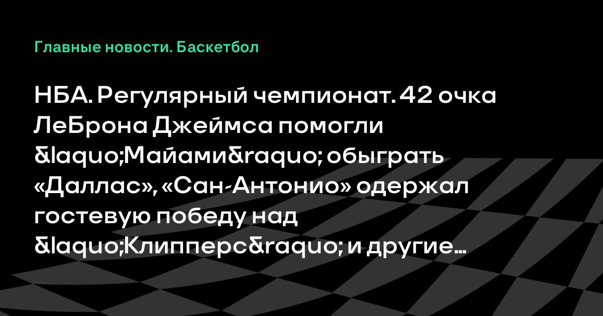 НБА. Регулярный чемпионат. 42 очка ЛеБрона Джеймса помогли «Майами» обыграть «Даллас», «Сан-Антонио» одержал гостевую победу над «Клипперс» и другие результаты Во вторник, после завершения перерыва на Матч всех звезд, в рамках регулярного чемпионата НБА состоялись девять матчей. Действующий чемпион «Майами» благодаря 42 очкам своего лидера ЛеБрона Джеймса взял верх над «Далласом» (117:106). Отсутствие в составе Тони Паркера, Кавая Ленарда и Тьяго Сплиттера не помешали «Сан-Антонио» одержать гостевую победу над «Клипперс» (113:103).