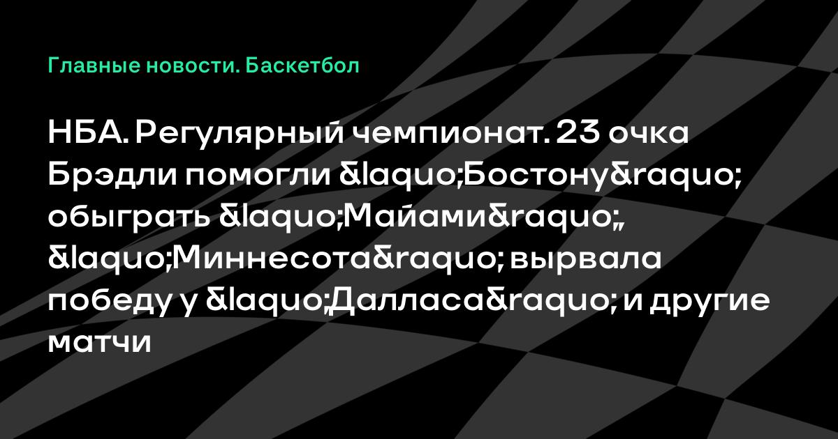 НБА. Регулярный чемпионат. 23 очка Брэдли помогли «Бостону» обыграть «Майами», «Миннесота» вырвала победу у «Далласа» и другие матчи Сегодня в рамках регулярного чемпионата НБА состоялись десять матчей. «Бостон» обыграл «Майами», трипл-дабл Рикки Рубио помог «Миннесота» взять верх над «Далласом» в овертайме.