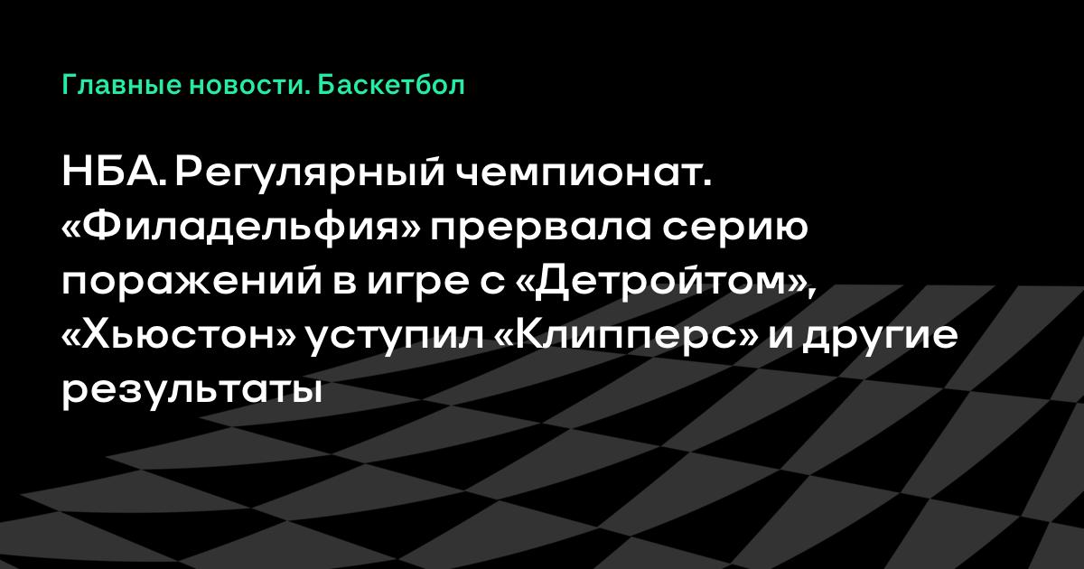 НБА. Регулярный чемпионат. «Филадельфия» прервала серию поражений в игре с «Детройтом», «Хьюстон» уступил «Клипперс» и другие результаты Сегодня в рамках регулярного чемпионата НБА состоялись шесть матчей. «Филадельфия» все же не стала обладателем самой продолжительной серии поражений в истории лиги. «Сиксерс» сумели избежать 27-й неудачи кряду в домашней игре с «Детройтом» (123:98). В Хьюстоне встретились западные фавориты – «Рокетс» уступили «Клипперс» со счетом 107:118.