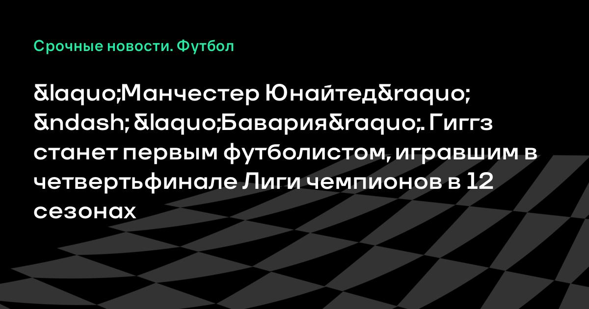 Полузащитник «Манчестер Юнайтед» Райан Гиггз попал в стартовый состав на матч с «Баварией» в четвертьфинале Лиги чемпионов.Гиггз стал первым футболистом, игравшим на стадии четвертьфинала в 12 разных сезонах Лиги чемпионов.