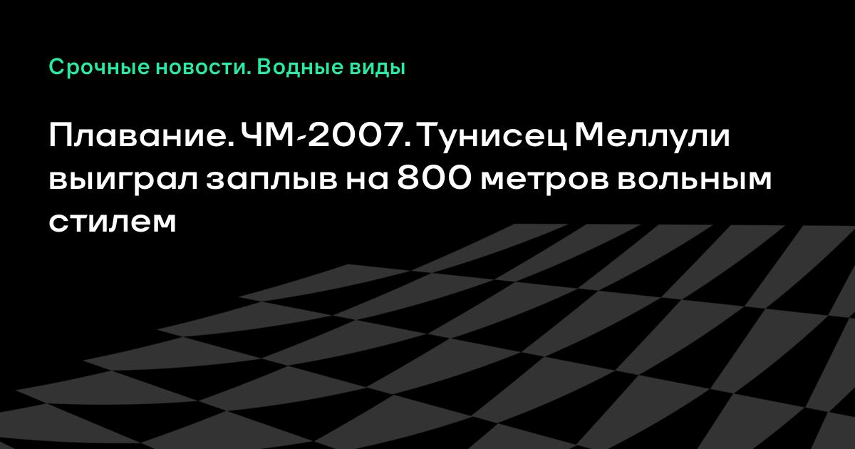 28 марта 2007, 15:08 Плавание. ЧМ-2007. Тунисец Меллули выиграл заплыв на 800 метров вольным стилем Тунисец Усама Меллули выиграл заплыв на 800 метров вольным стилем на чемпионате мира по водным видам спорта. Его результат - 7.46,95. Водные виды плавание результаты Чемпионат мира по водным видам спорта Уссама Меллули