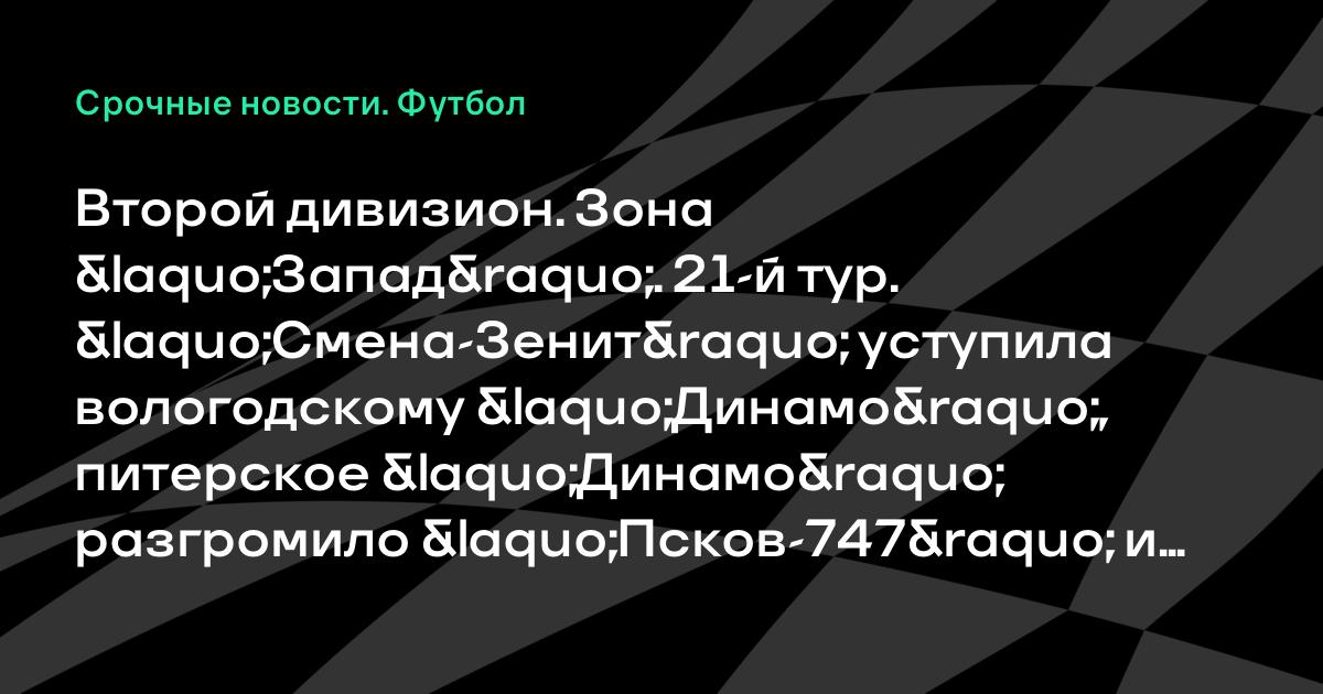 Второй дивизион. Зона «Запад». 21-й тур. «Смена-Зенит» уступила вологодскому «Динамо», питерское «Динамо» разгромило «Псков-747» и другие результаты