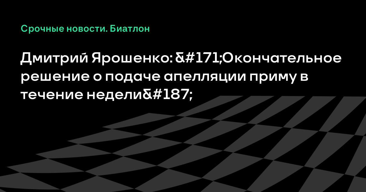 Российский биатлонист Дмитрий Ярошенко пока не принял решение относительно подачи апелляции в Спортивный арбитражный суд (CAS) на двухлетнюю дисквалификацию.