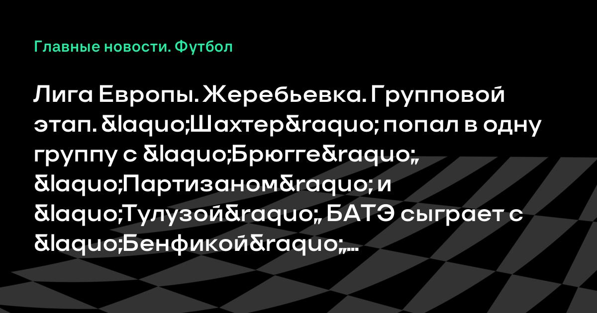 Лига Европы. Жеребьевка. Групповой этап. «Шахтер» попал в одну группу с «Брюгге», «Партизаном» и «Тулузой», БАТЭ сыграет с «Бенфикой», «Эвертоном» и АЕК