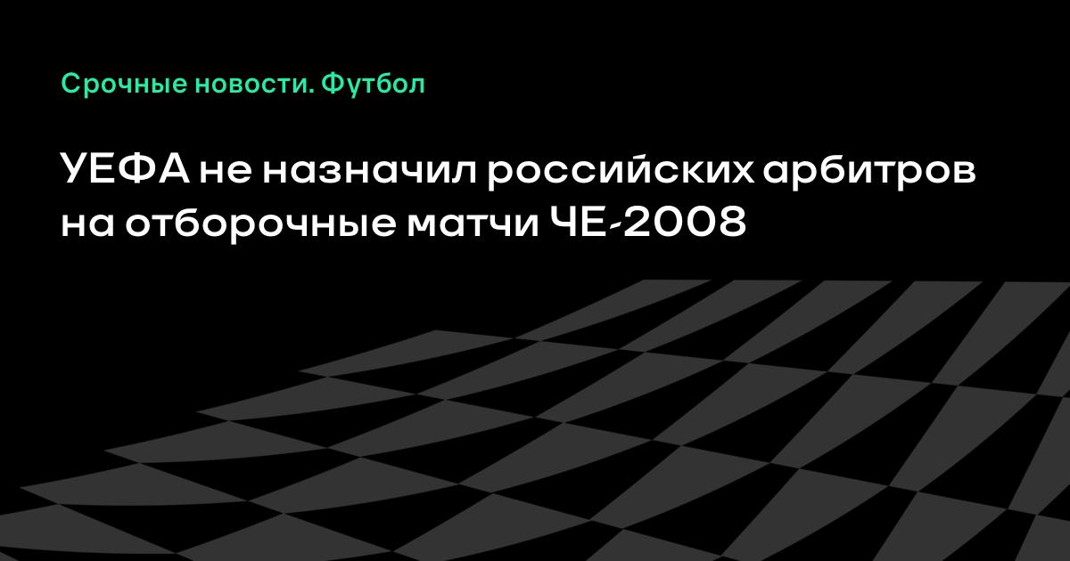 12 ноября 2006, 13:56 УЕФА не назначил российских арбитров на отборочные матчи ЧЕ-2008 Оргкомитет УЕФА не назначил российских арбитров обслуживать отборочные матчи чемпионата Европы-2008, которые состоятся 15 ноября.