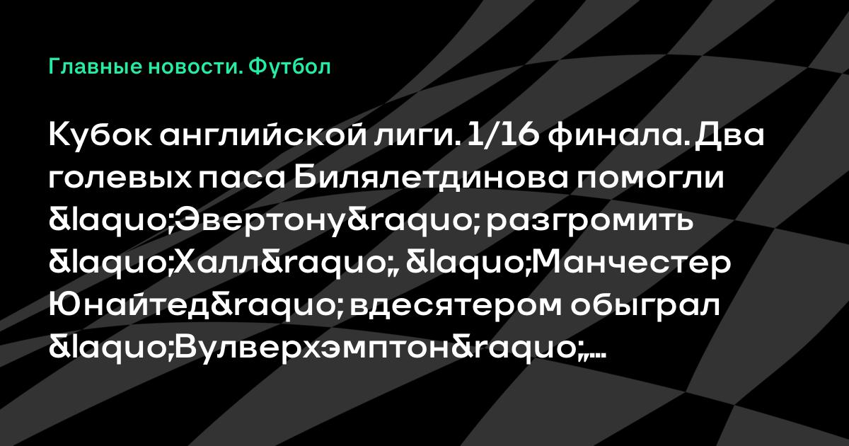 Кубок английской лиги. 1/16 финала. Два голевых паса Билялетдинова помогли «Эвертону» разгромить «Халл», «Манчестер Юнайтед» вдесятером обыграл «Вулверхэмптон», «Тоттенхэм» крупно выиграл у «Престона» и другие результаты