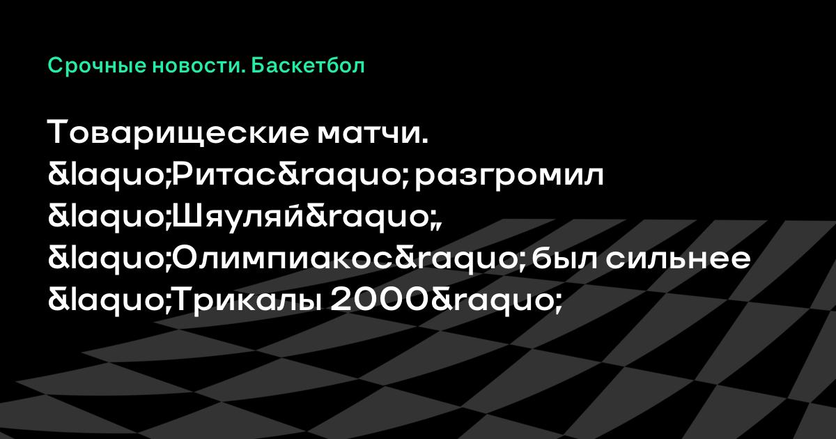 23 сентября 2009, 10:37 Товарищеские матчи. «Ритас» разгромил «Шяуляй», «Олимпиакос» был сильнее «Трикалы 2000» Товарищеские матчи Шяуляй Литва Летувос Ритас Литва 76:111 Олимпиакос Греция Трикала-2000 Греция 89:79 Баскетбол результаты товарищеские матчи Олимпиакос Ритас Шяуляй Трикала 2000
