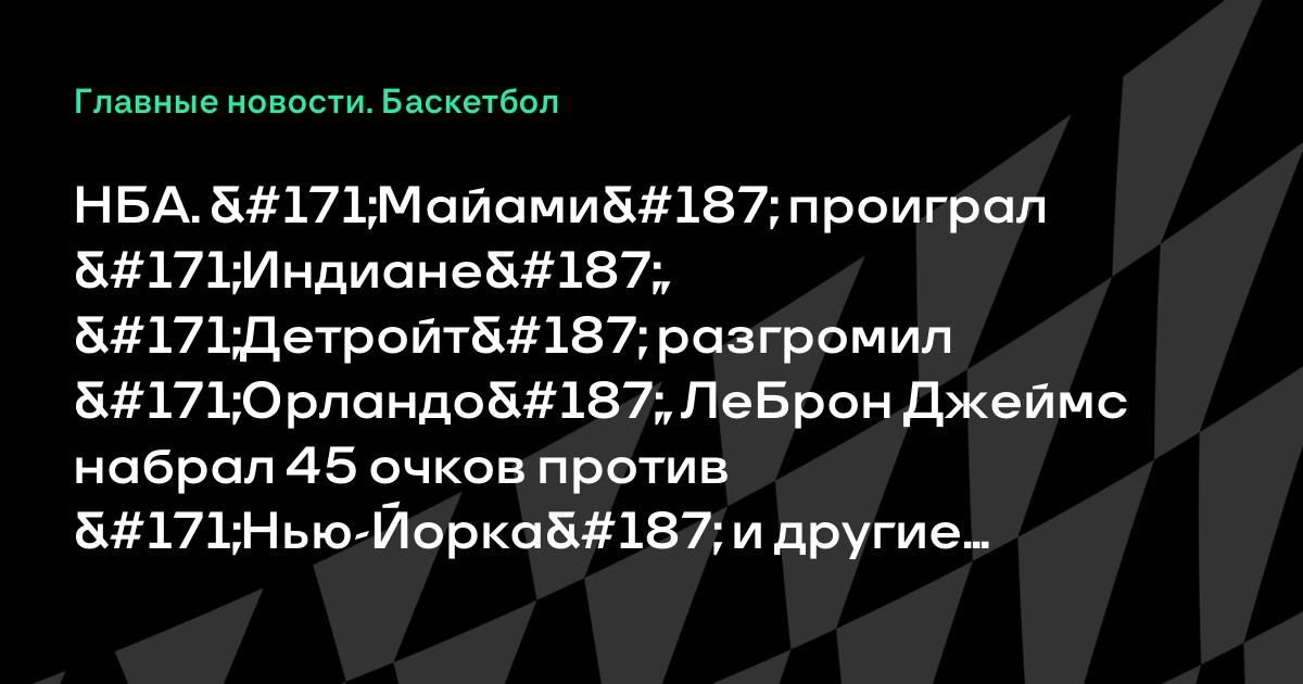НБА. «Майами» проиграл «Индиане», «Детройт» разгромил «Орландо», ЛеБрон Джеймс набрал 45 очков против «Нью-Йорка» и другие результаты
