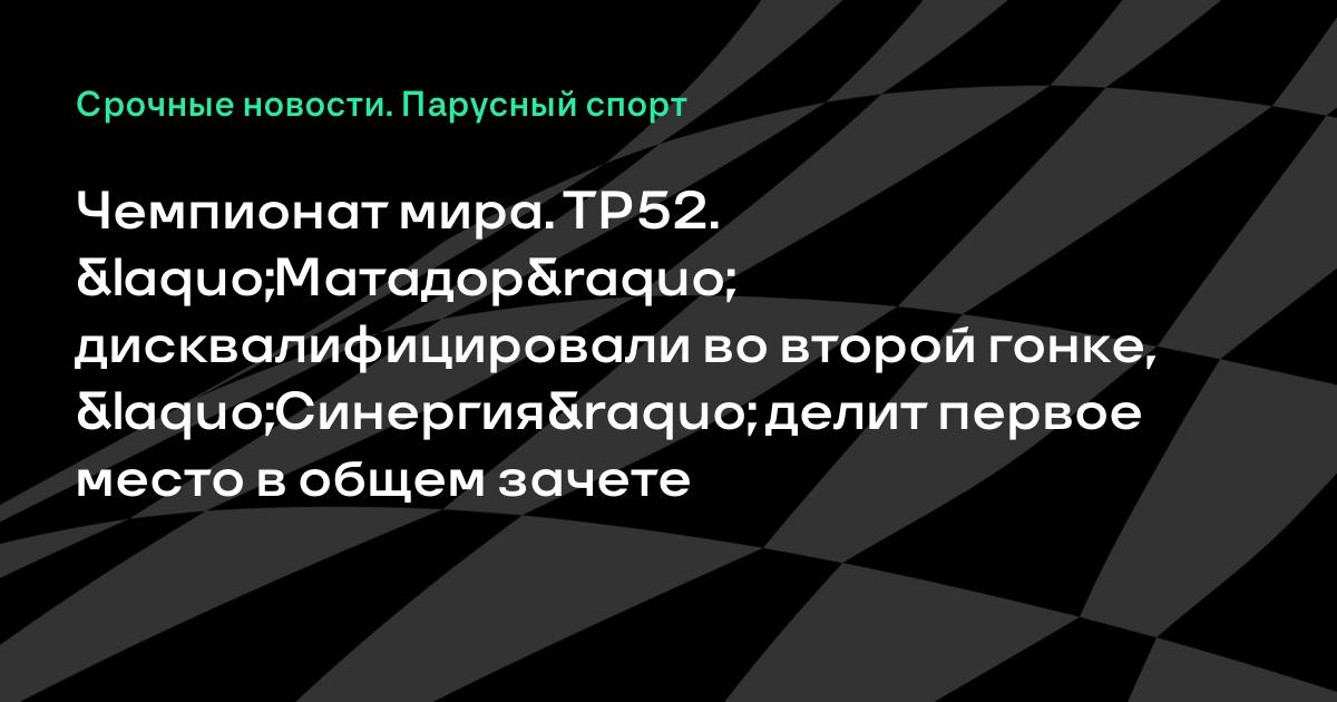Аргентинскую команду «Матадор» дисквалифицировали за неправильное прохождение дистанции во второй гонке чемпионата мира в престижном классе яхт TP52 и оштрафовали на 11 очков (именно столько получает не финишировавшие участники; за последнее место начисляется 10 очков). Таким образом, «Синергия», которая вчера заняла пятое место в вечерней гонке, поднялась на четвертое и по сумме очков (2+4) возглавляет общий зачет вместе с главными фаворитами – Quantium Racing (США).