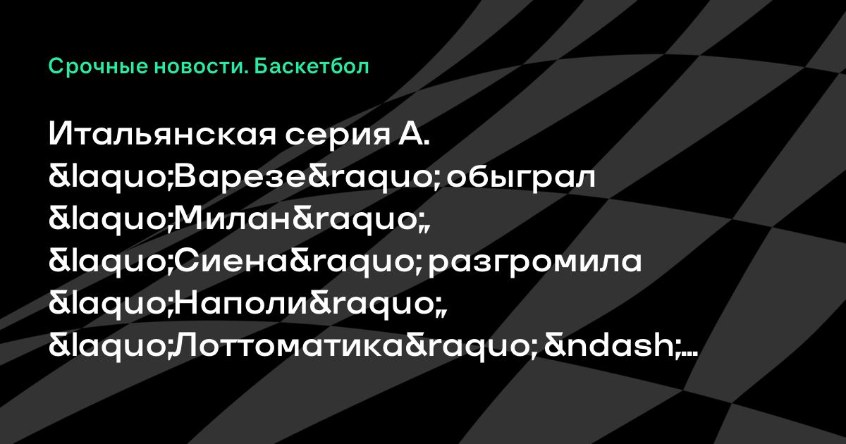 Итальянская серия А. «Варезе» обыграл «Милан», «Сиена» разгромила «Наполи», «Лоттоматика» – «Кремону» и другие результаты