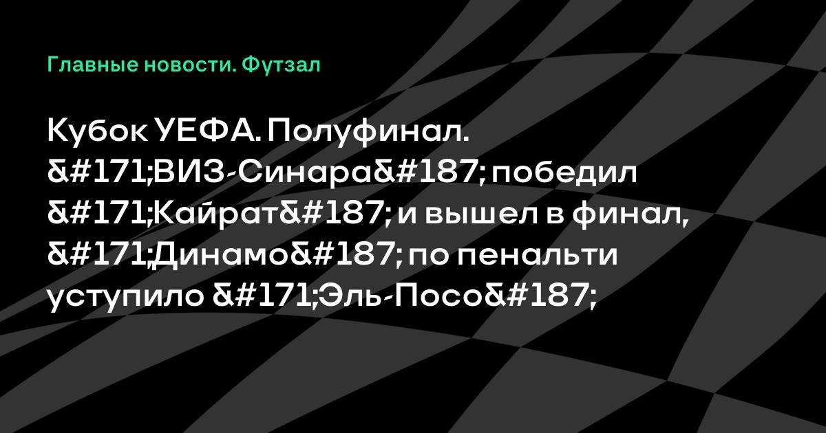 25 апреля 2008, 23:01 Кубок УЕФА. Полуфинал. «ВИЗ-Синара» победил «Кайрат» и вышел в финал, «Динамо» по пенальти уступило «Эль-Посо» Кубок УЕФА Полуфинал Кайрат Казахстан ВИЗ-Синара Россия 1:4 (1:0) Эль-Посо Испания – Динамо Москва, Россия – 1:1 (1:1, 0:0, 0:0), по пенальти – 4:2. Футзал Синара Динамо результаты Кубок УЕФА Кайрат Эль-Посо