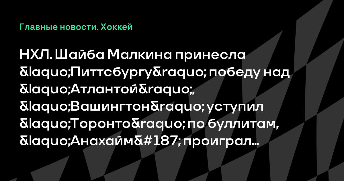 НХЛ. Шайба Малкина принесла «Питтсбургу» победу над «Атлантой», «Вашингтон» уступил «Торонто» по буллитам, «Анахайм» проиграл «Сан-Хосе» и другие результаты
