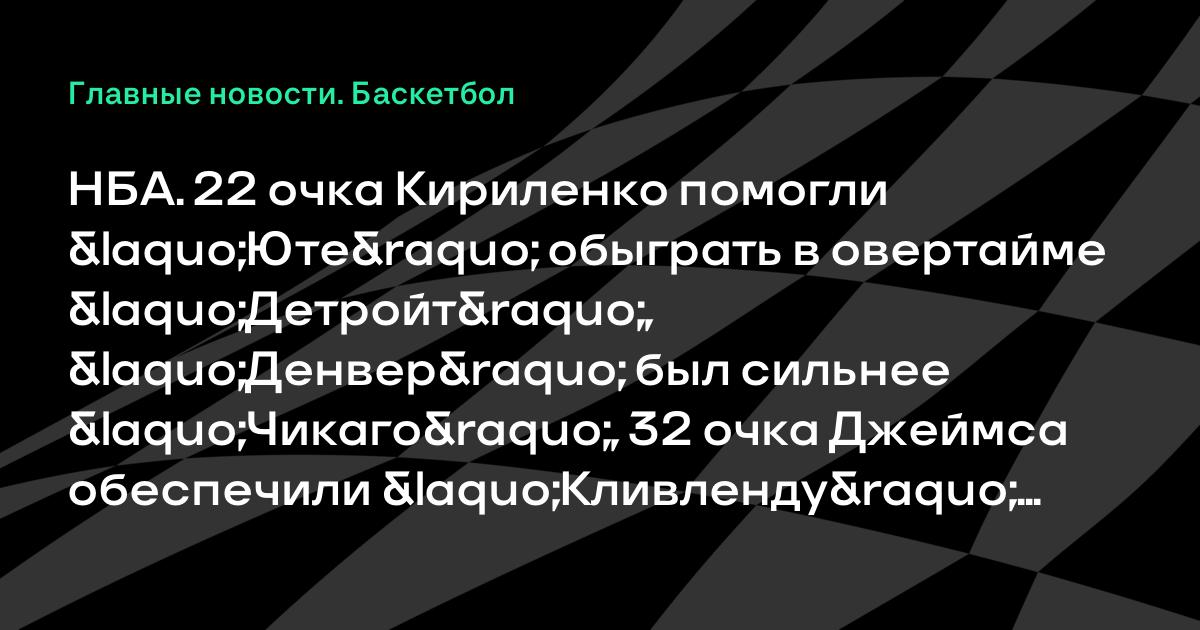 НБА. 22 очка Кириленко помогли «Юте» обыграть в овертайме «Детройт», «Денвер» был сильнее «Чикаго», 32 очка Джеймса обеспечили «Кливленду» победу над «Филадельфией» и другие результаты