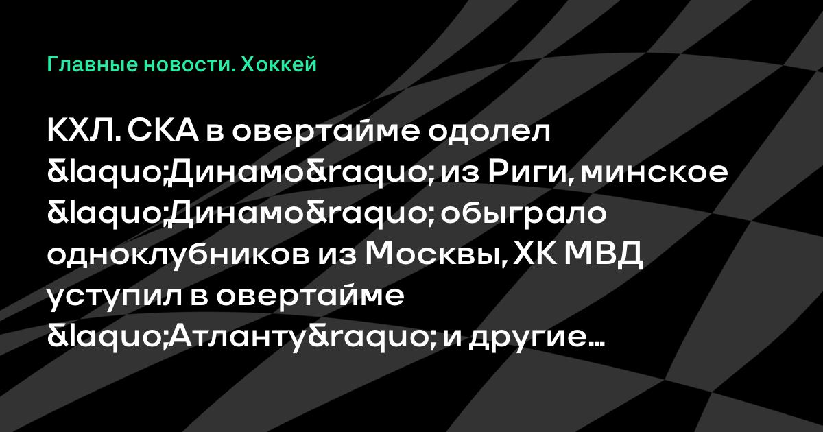 КХЛ. СКА в овертайме одолел «Динамо» из Риги, минское «Динамо» обыграло одноклубников из Москвы, ХК МВД уступил в овертайме «Атланту» и другие результаты