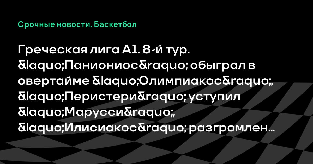 Греческая лига А1. 8-й тур. «Паниониос» обыграл в овертайме «Олимпиакос», «Перистери» уступил «Марусси», «Илисиакос» разгромлен «Панатинаикосом» и другие результаты