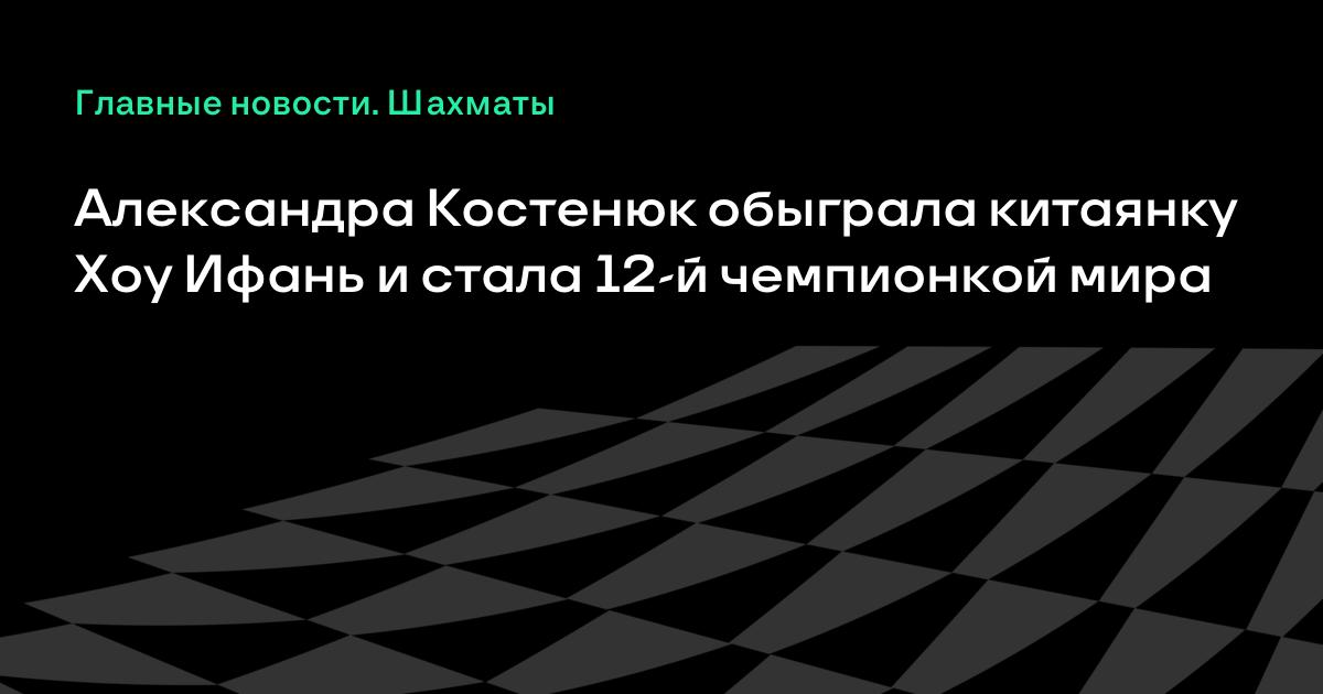 Россиянка Александра Костенюк обыграла китаянку Хоу Ифань (2,5:1,5) и стала 12-й чемпионкой мира по шахматам. Последний раз советская шахматистка становилась чемпионкой мира в 1991 году. С тех пор никто из девушек из стран СНГ не выигрывал почетный титул.