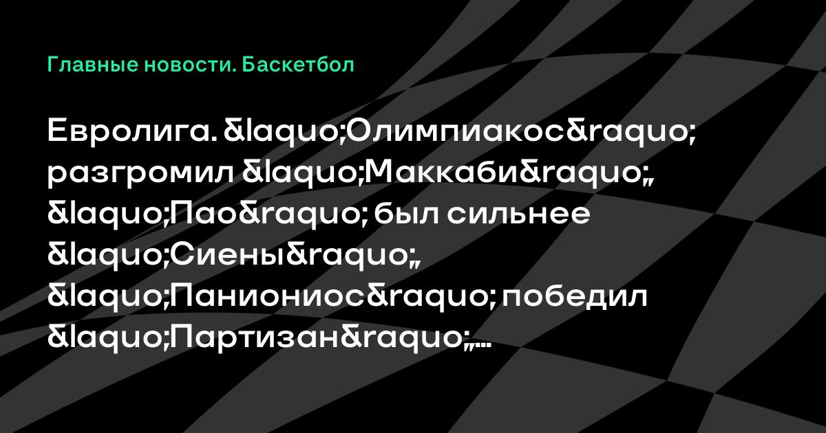 Евролига. «Олимпиакос» разгромил «Маккаби», «Пао» был сильнее «Сиены», «Паниониос» победил «Партизан», «Альба» превзошла «Ховентуд» и другие результаты