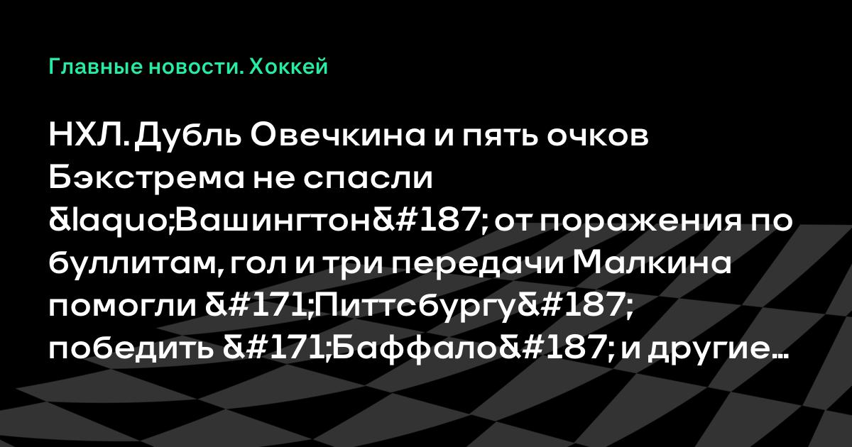 НХЛ. Дубль Овечкина и пять очков Бэкстрема не спасли «Вашингтон» от поражения по буллитам, гол и три передачи Малкина помогли «Питтсбургу» победить «Баффало» и другие результаты