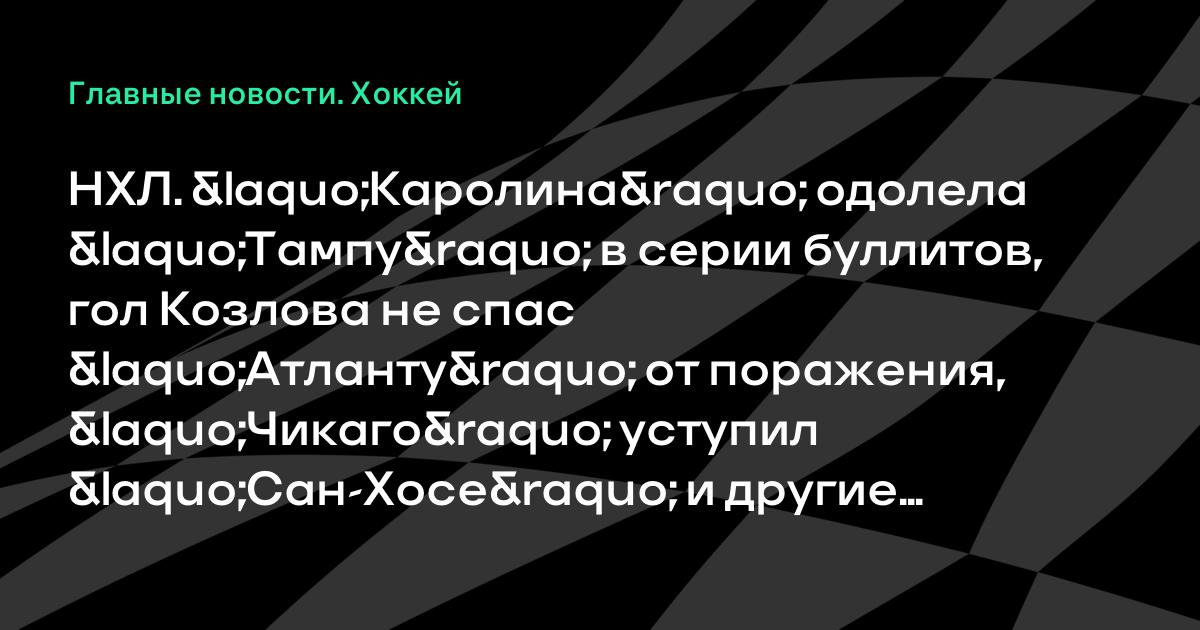 НХЛ. «Каролина» одолела «Тампу» в серии буллитов, гол Козлова не спас «Атланту» от поражения, «Чикаго» уступил «Сан-Хосе» и другие результаты
