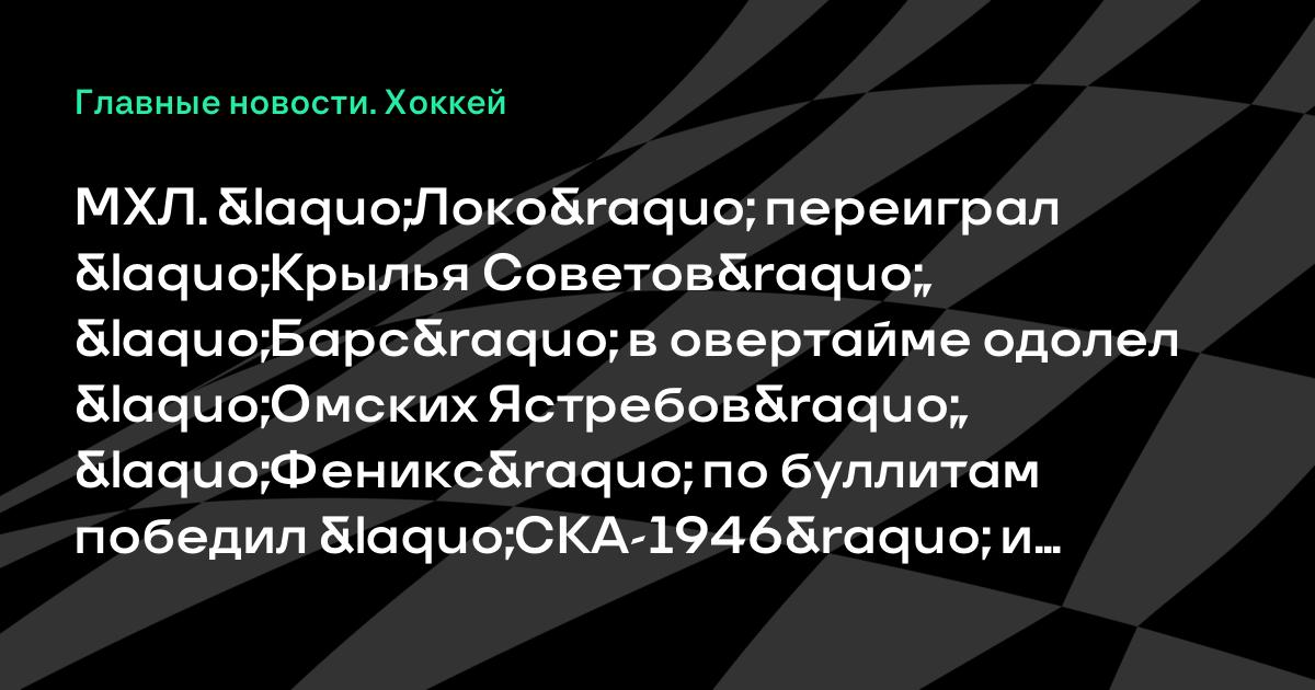 МХЛ. «Локо» переиграл «Крылья Советов», «Барс» в овертайме одолел «Омских Ястребов», «Феникс» по буллитам победил «СКА-1946» и другие результаты