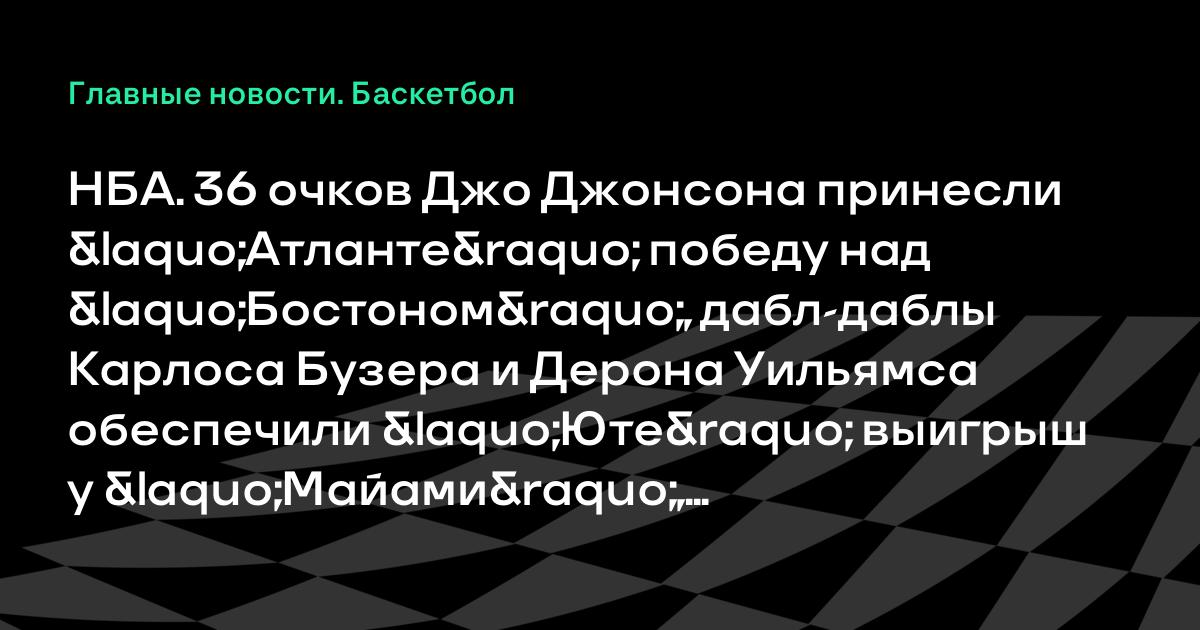 НБА. 36 очков Джо Джонсона принесли «Атланте» победу над «Бостоном», дабл-даблы Карлоса Бузера и Дерона Уильямса обеспечили «Юте» выигрыш у «Майами», «Филадельфия» была сильнее «Нью-Орлеана» и другие результаты