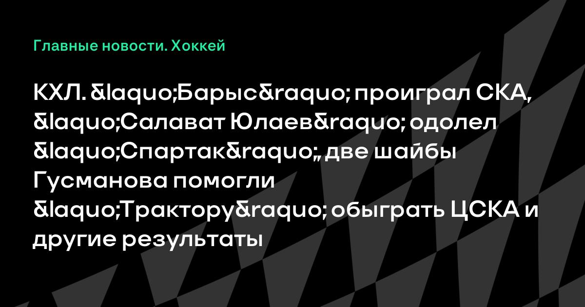 КХЛ. «Барыс» проиграл СКА, «Салават Юлаев» одолел «Спартак», две шайбы Гусманова помогли «Трактору» обыграть ЦСКА и другие результаты