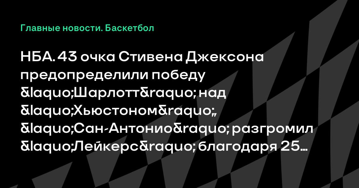 НБА. 43 очка Стивена Джексона предопределили победу «Шарлотт» над «Хьюстоном», «Сан-Антонио» разгромил «Лейкерс» благодаря 25 очкам Данкана и 22 Паркера, «Мемфис» обыграл «Клипперс», несмотря на трипл-дабл Бэрона Дэвиса и другие результаты