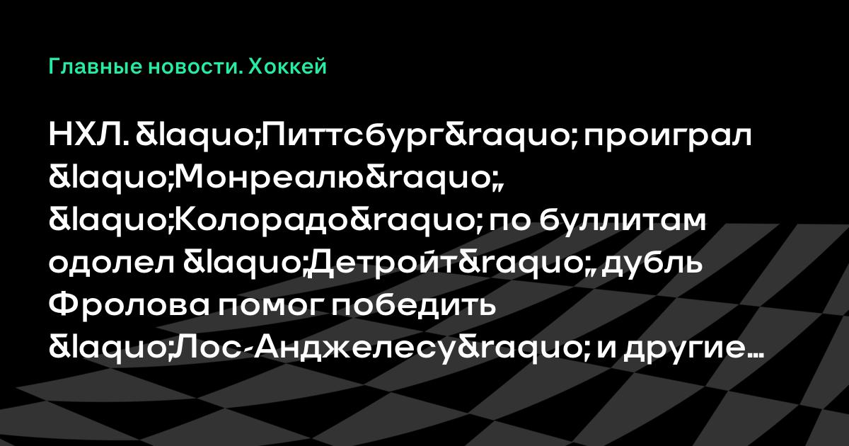 НХЛ. «Питтсбург» проиграл «Монреалю», «Колорадо» по буллитам одолел «Детройт», дубль Фролова помог победить «Лос-Анджелесу» и другие результаты