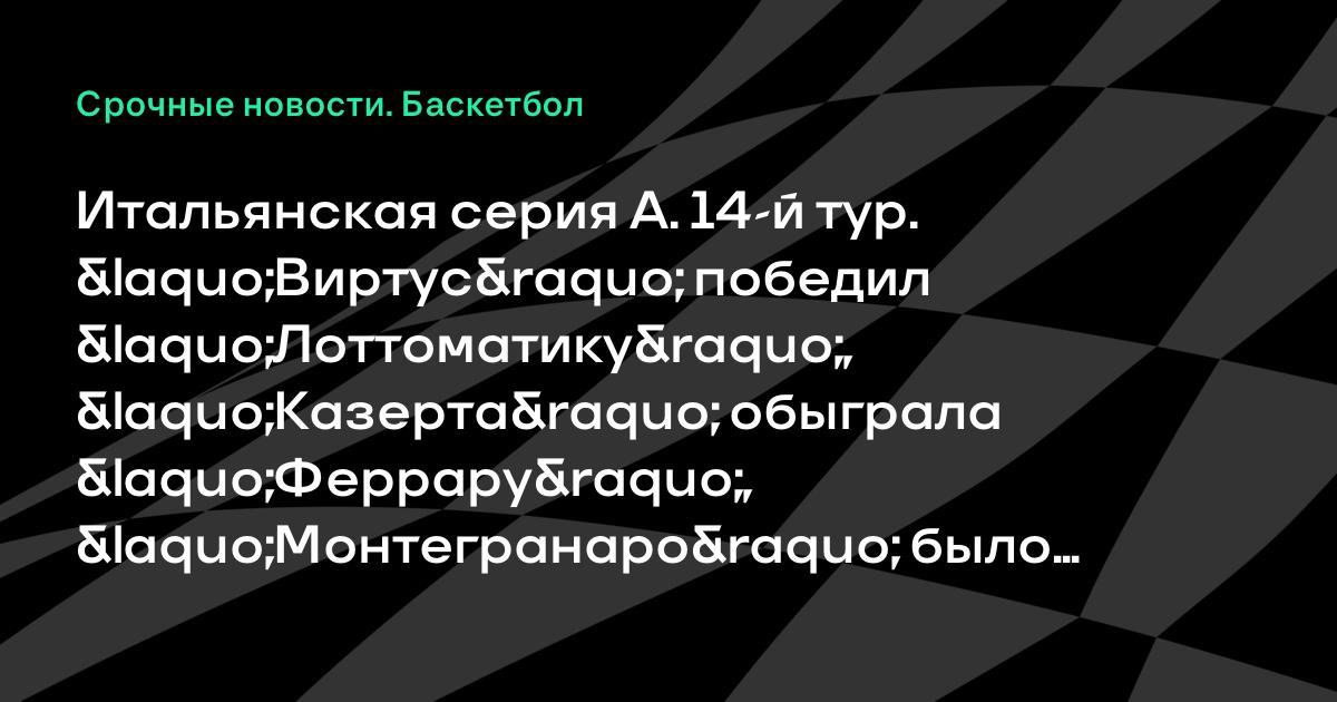 Итальянская серия А. 14-й тур. «Виртус» победил «Лоттоматику», «Казерта» обыграла «Феррару», «Монтегранаро» было сильнее «Милана» и другие результаты