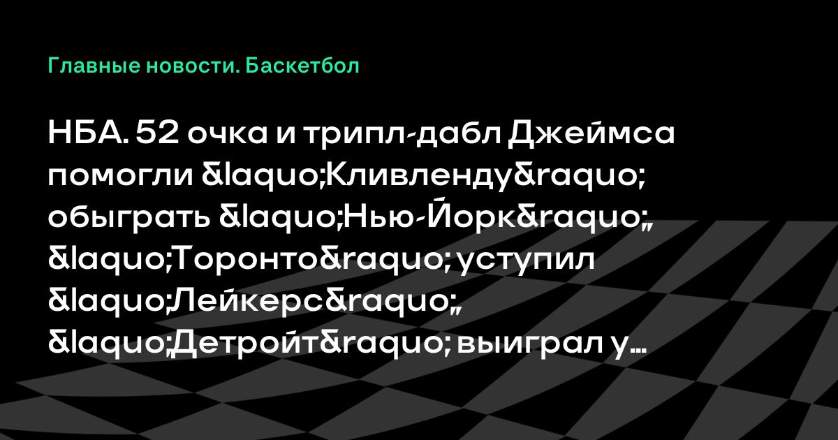 НБА. 52 очка и трипл-дабл Джеймса помогли «Кливленду» обыграть «Нью-Йорк», «Торонто» уступил «Лейкерс», «Детройт» выиграл у «Майами», «Даллас» был сильнее «Портленда» и другие результаты