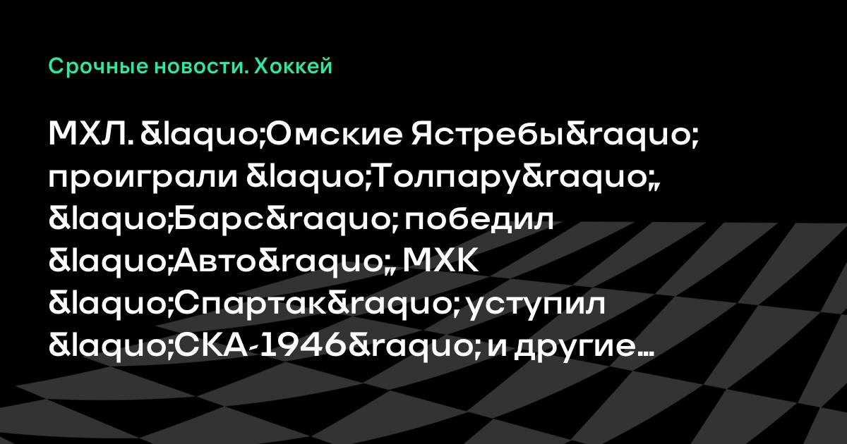 МХЛ. «Омские Ястребы» проиграли «Толпару», «Барс» победил «Авто», МХК «Спартак» уступил «СКА-1946» и другие результаты