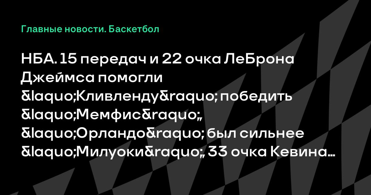 НБА. 15 передач и 22 очка ЛеБрона Джеймса помогли «Кливленду» победить «Мемфис», «Орландо» был сильнее «Милуоки», 33 очка Кевина Дюрэнта обеспечили «Оклахома-Сити» успех в матче с «Атлантой» и другие результаты