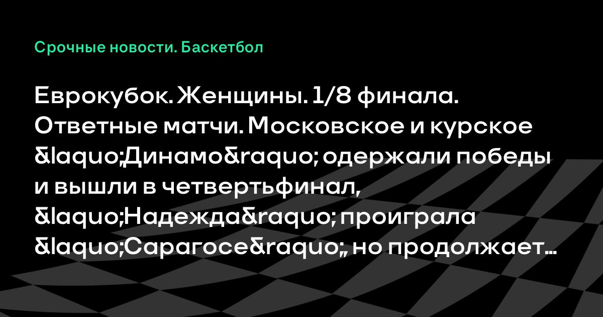 Еврокубок. Женщины. 1/8 финала. Ответные матчи. Московское и курское «Динамо» одержали победы и вышли в четвертьфинал, «Надежда» проиграла «Сарагосе», но продолжает борьбу и другие результаты