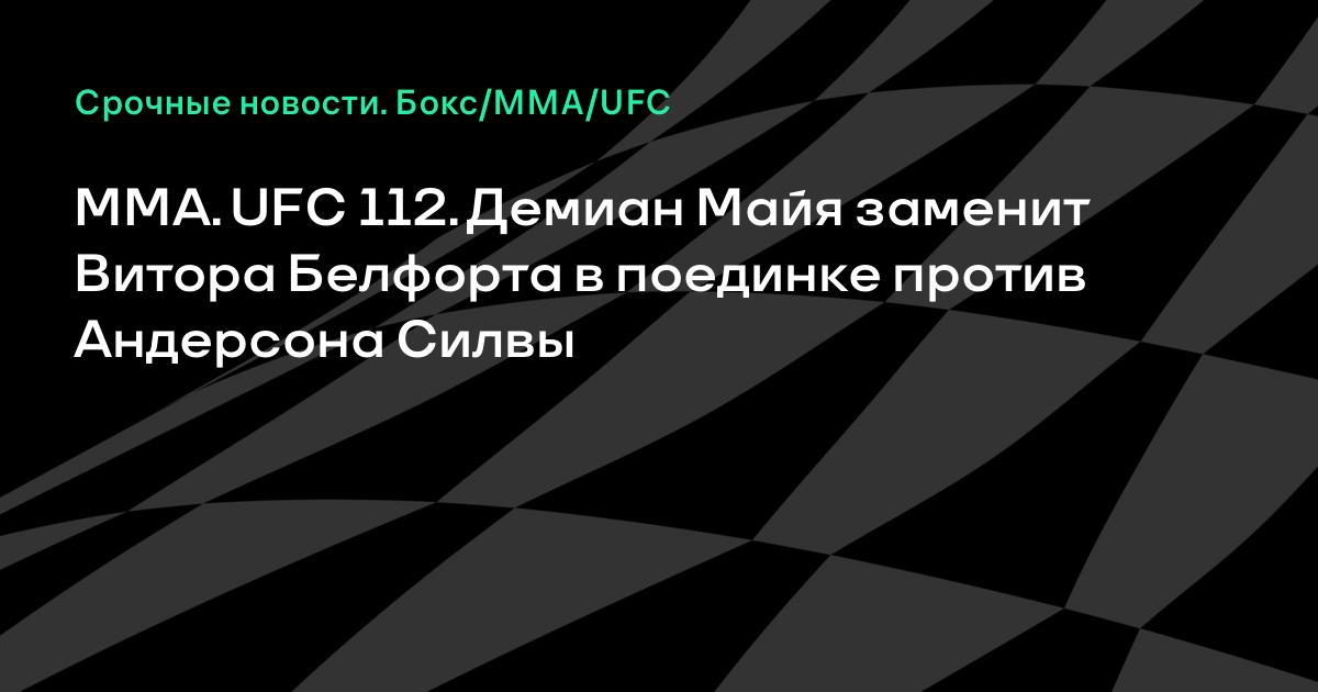 Бразилец Демиан Майя заменит травмированного соотечественника Витора Белфорта в поединке против еще одного бразильца чемпиона UFC в среднем весе Андерсона Силвы. Напомним, что бой состоится 10 апреля в рамках шоу UFC 112 в Абу-Даби (ОАЭ), сообщает MMAWeekly.com.