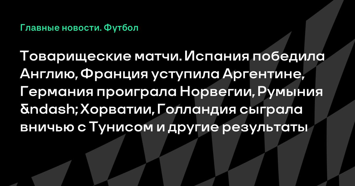 Товарищеские матчи. Испания победила Англию, Франция уступила Аргентине, Германия проиграла Норвегии, Румыния – Хорватии, Голландия сыграла вничью с Тунисом и другие результаты