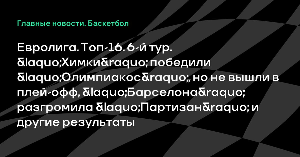 Евролига. Топ-16. 6-й тур. «Химки» победили «Олимпиакос», но не вышли в плей-офф, «Барселона» разгромила «Партизан» и другие результаты