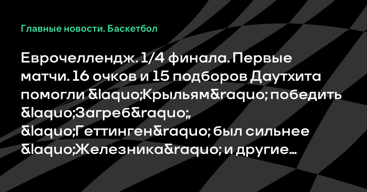 Еврочеллендж. 1/4 финала. Первые матчи. 16 очков и 15 подборов Даутхита помогли «Крыльям» победить «Загреб», «Геттинген» был сильнее «Железника» и другие результаты