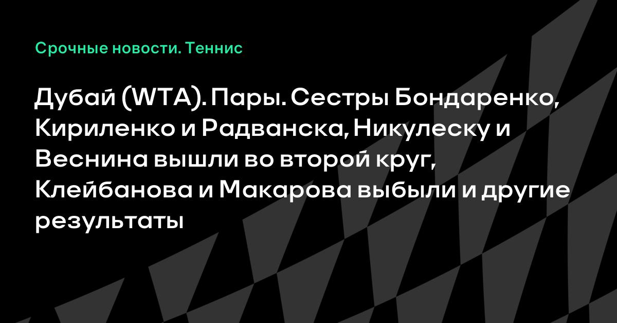 Дубай (WTA). Пары. Сестры Бондаренко, Кириленко и Радванска, Никулеску и Веснина вышли во второй круг, Клейбанова и Макарова выбыли и другие результаты